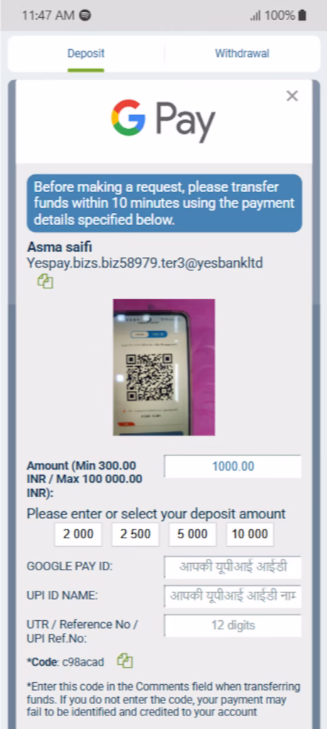 - Enter deposit amount within allowed platform limits